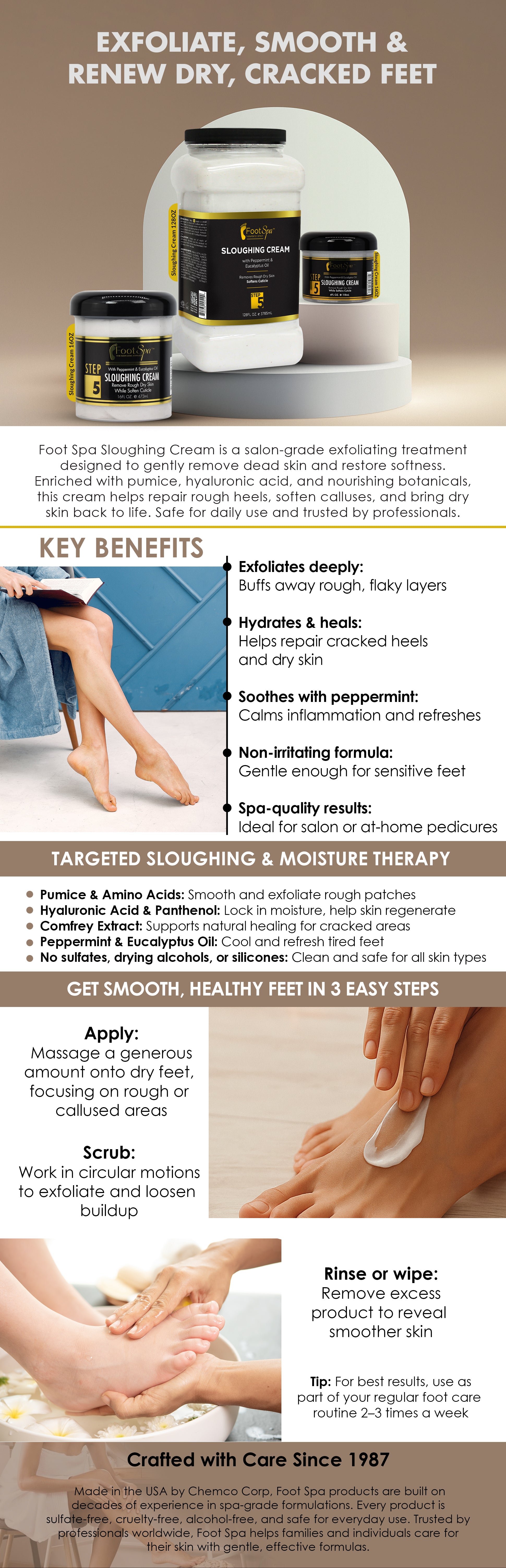 - Professional Exfoliation & Smoothing: Foot Spa Sloughing Cream gently removes dead skin buildup, leaving feet soft, smooth, and revitalized.