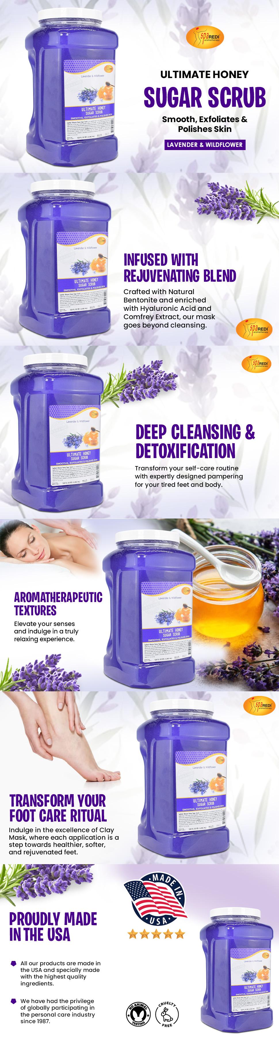 SPA REDI Sugar Body Scrub in Lavender & Wildflower is expertly crafted to exfoliate, moisturize, and nourish your skin, leaving it glowing and polished.