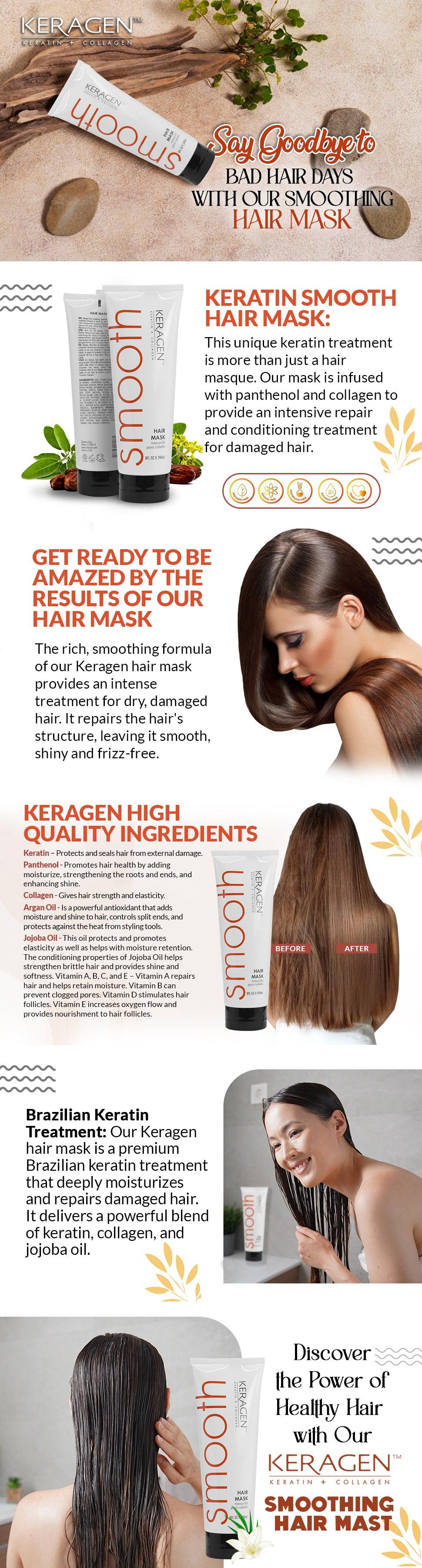 The Keragen Keratin Smoothing Hair Mask is an intensive treatment designed to repair and restore even the most damaged strands. Infused with keratin, collagen, panthenol, and jojoba oil, it deeply hydrates, smooths frizz, and leaves hair soft, strong, and radiant.