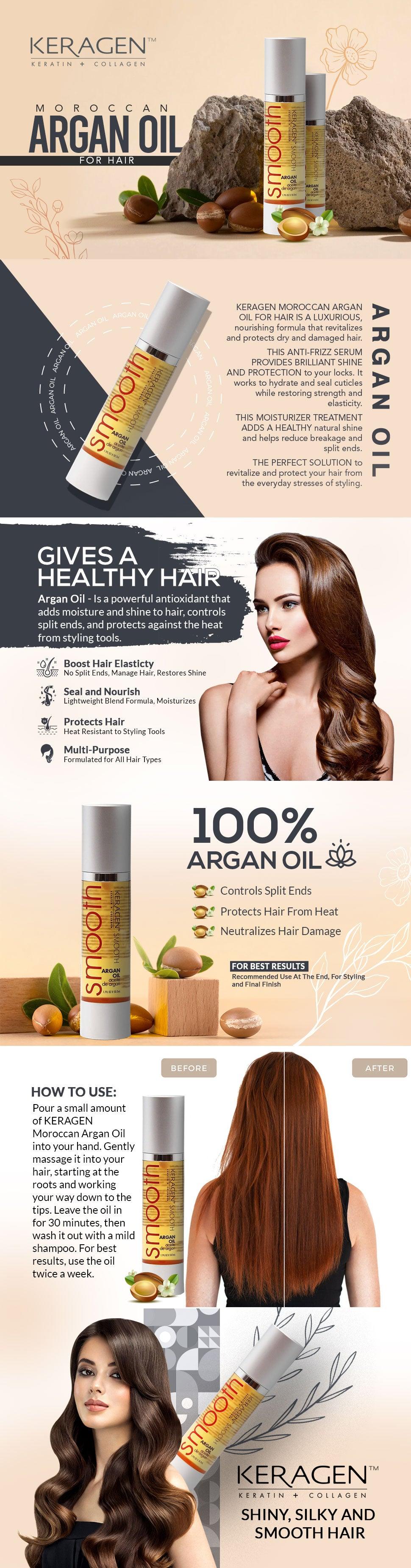 The Keragen Moroccan Argan Oil Serum delivers deep hydration, heat protection, and brilliant shine for dry or damaged hair. Enriched with keratin, collagen, and pure argan oil, this lightweight formula strengthens, restores elasticity, and tames frizz—leaving hair silky, smooth, and manageable.