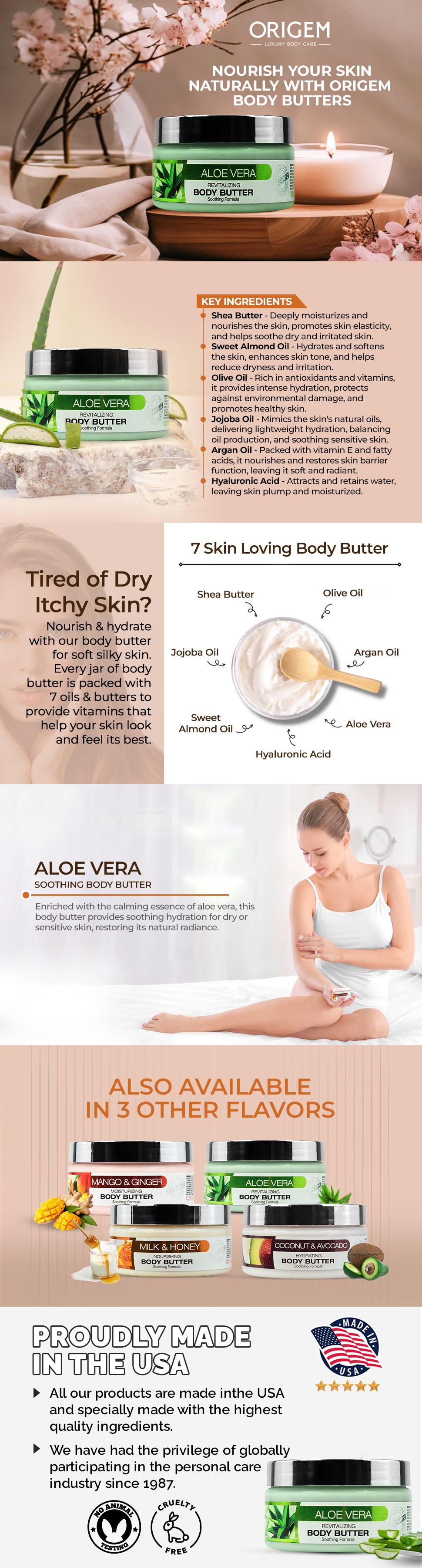 ORIGEM Body Butter Aloe Vera – Ultra-Nourishing and Hydrating Body Cream with Argan Oil, Shea Butter, and Honey for Soft, Smooth Skin – For All Skin Types