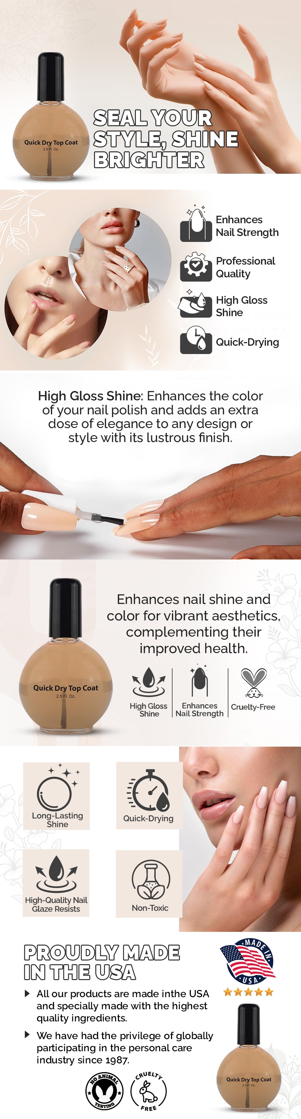 This fast-drying formula ensures your polish dries quickly, helping to prevent smudging and chipping while providing a long-lasting shine.