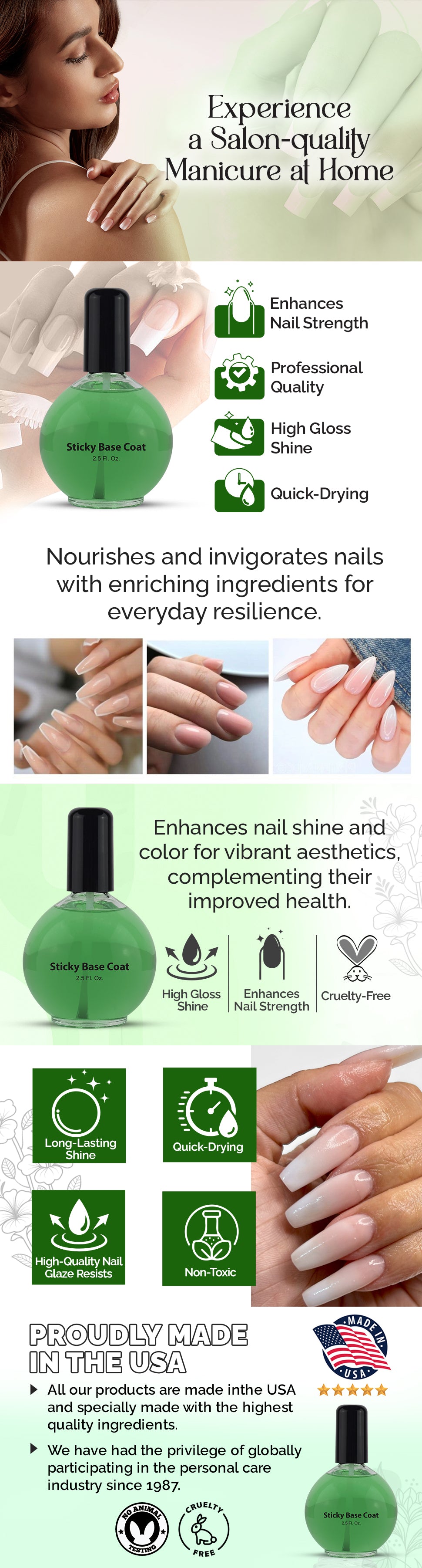 This essential base coat is specially formulated to enhance the adhesion of nail polish, ensuring longer-lasting wear and vibrant color. Its sticky formula creates the perfect foundation for your favorite shades, preventing chipping and peeling.