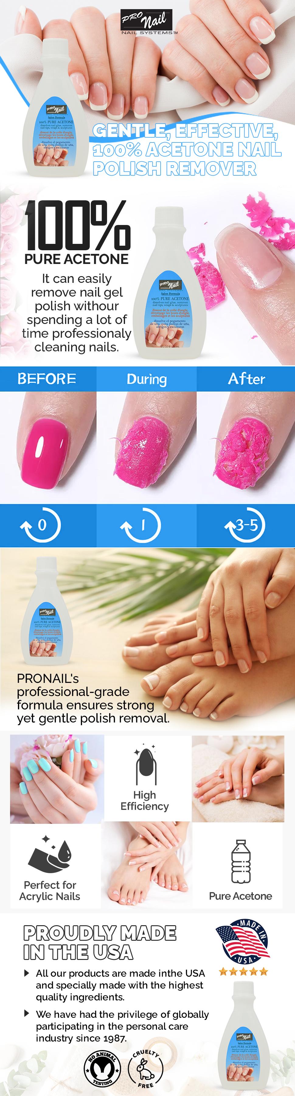 PRO NAIL Pure Acetone is a powerful nail polish remover designed to quickly and effectively eliminate all types of nail polish.